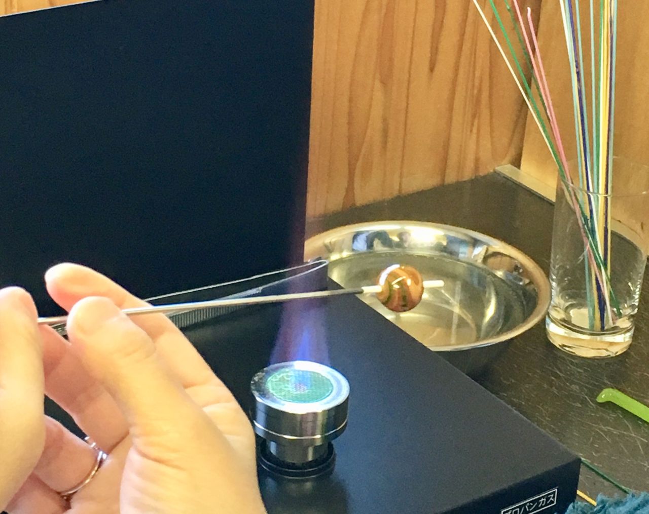 溶けて動くガラスにドキドキなとんぼ玉体験、こちらのお客様も「寿命が縮まりそう〜」と仰っていました